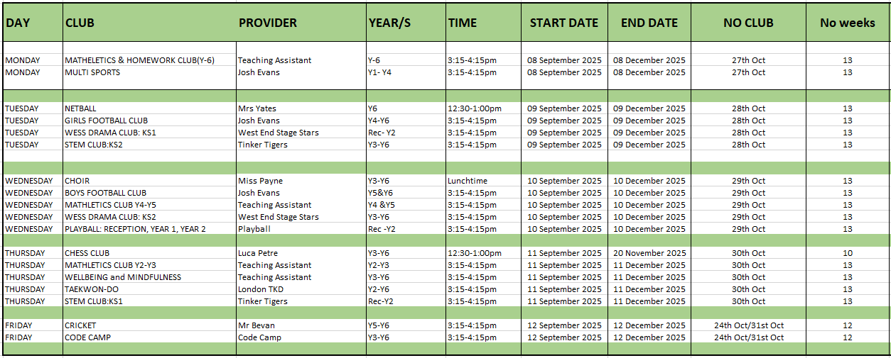 - To secure a place for EXTERNAL clubs, please contact the external providers directly – all payments / queries must be direct with the club provider. Please read their attached club letters carefully for all information.