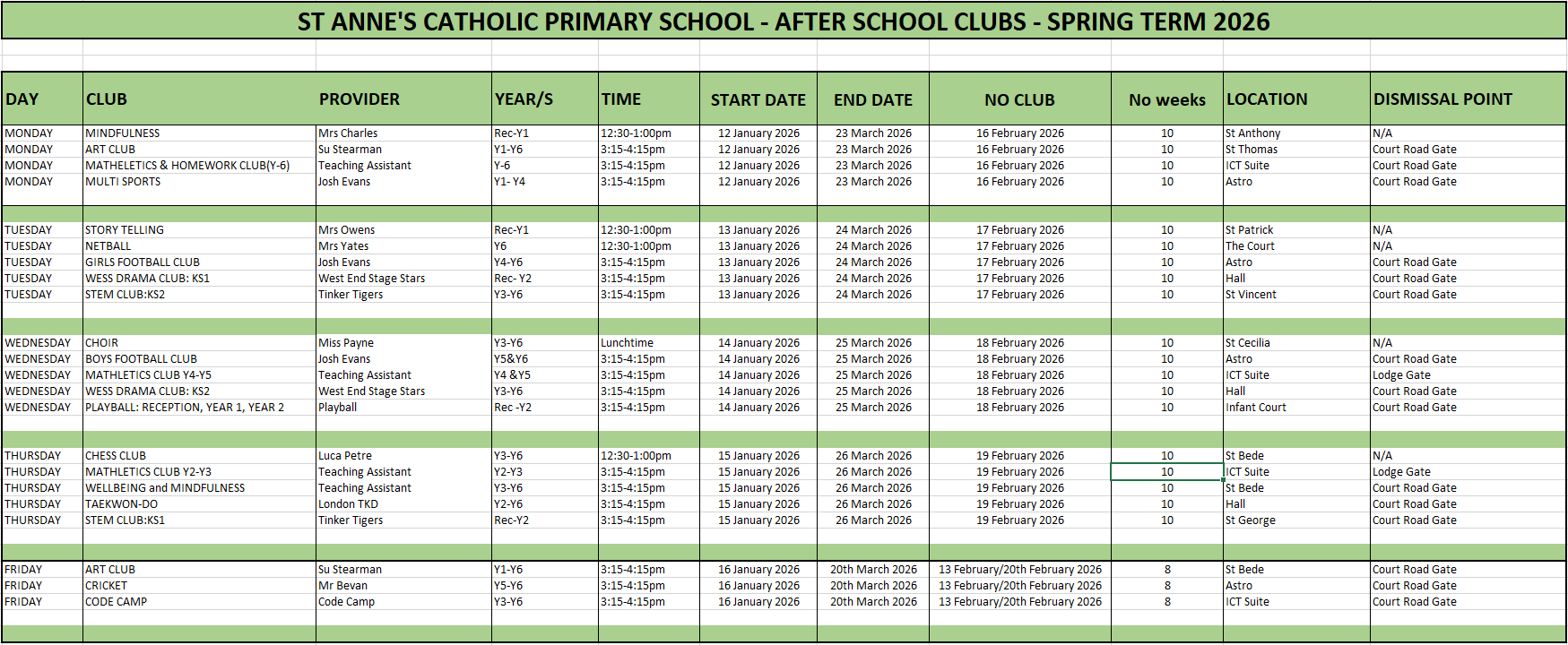 Spring Clubs therefore run for 10 weeks in total, 8 weeks for Friday clubs